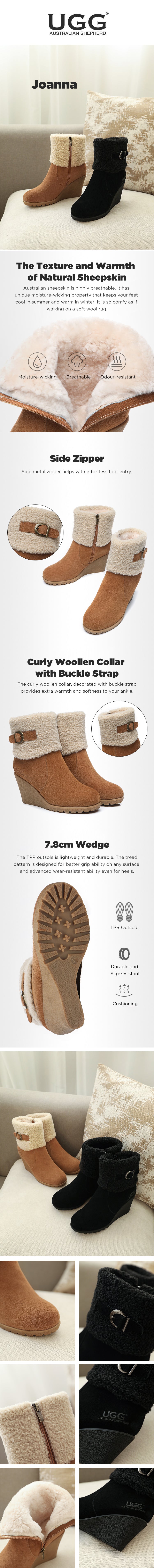 Australian Shepherd® Zipper Sheepskin Shearling Wedge Fashion Boots Women Joanna #AS7010 Description: The Australian Shepherd Joanna Fashion Boots combine the best of footwear - style, and practicality. The upper is...